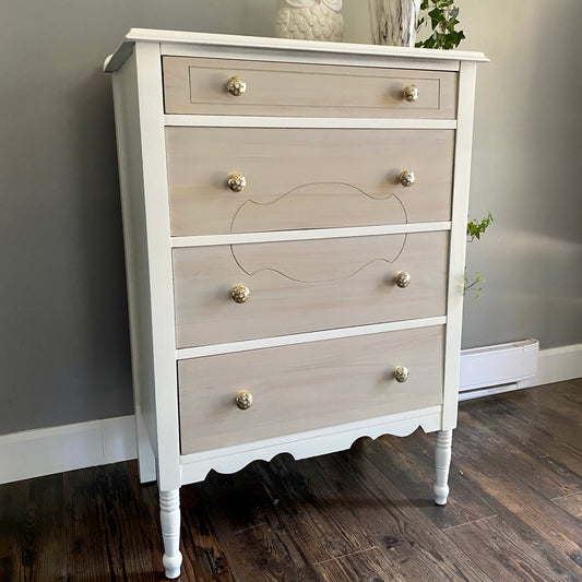 Antique 4 Drawer Dresser in White and Tan Wash Pearl Inlay Knobs
