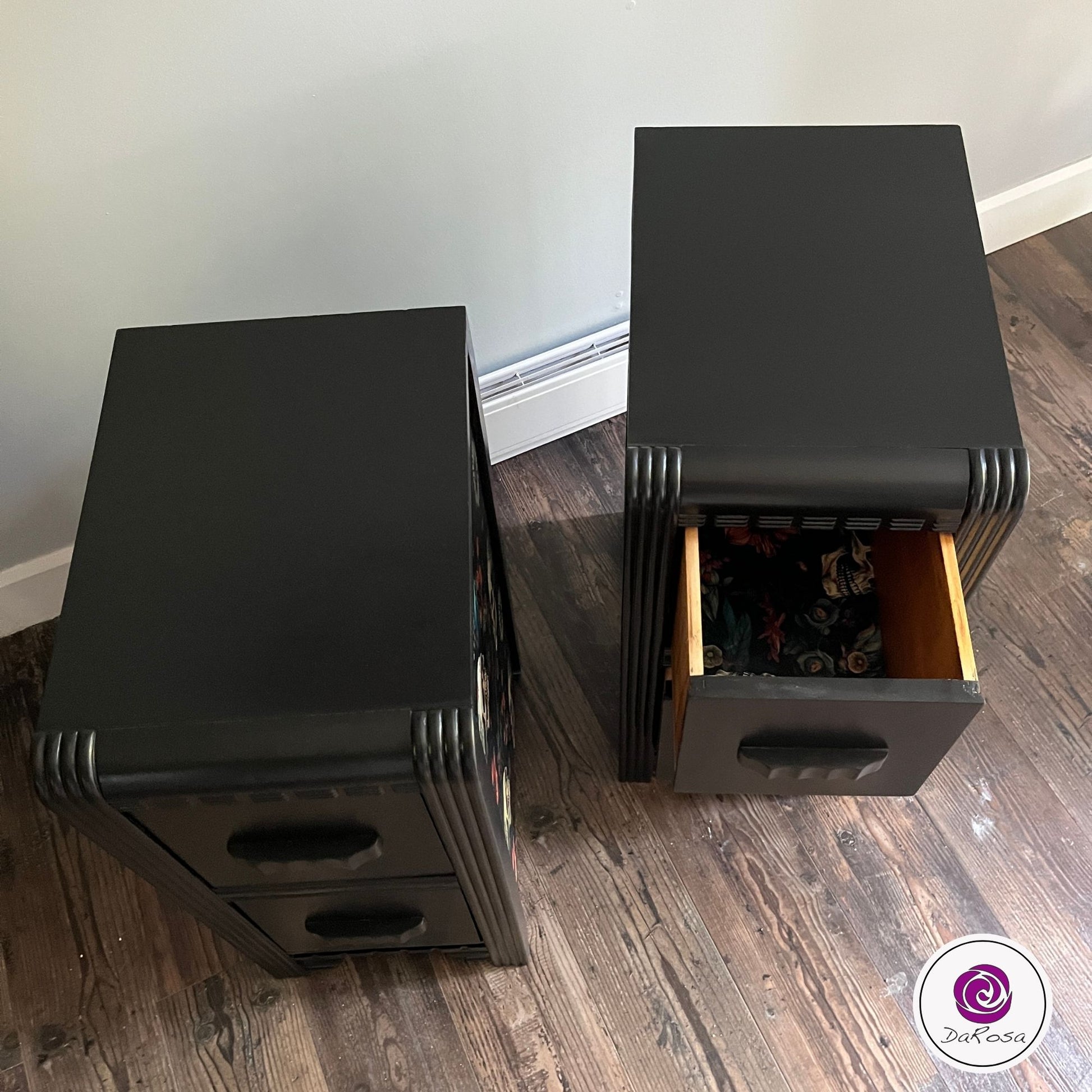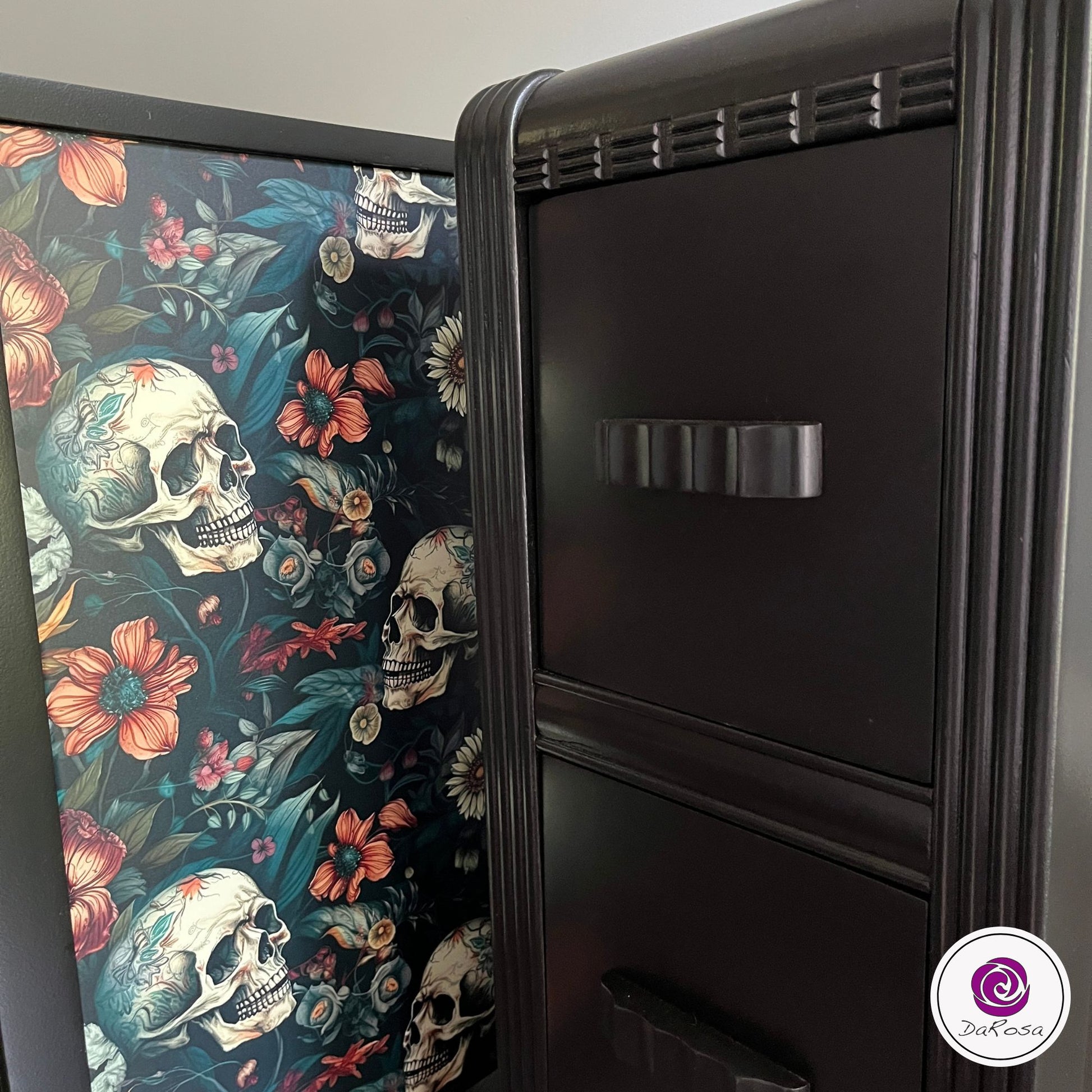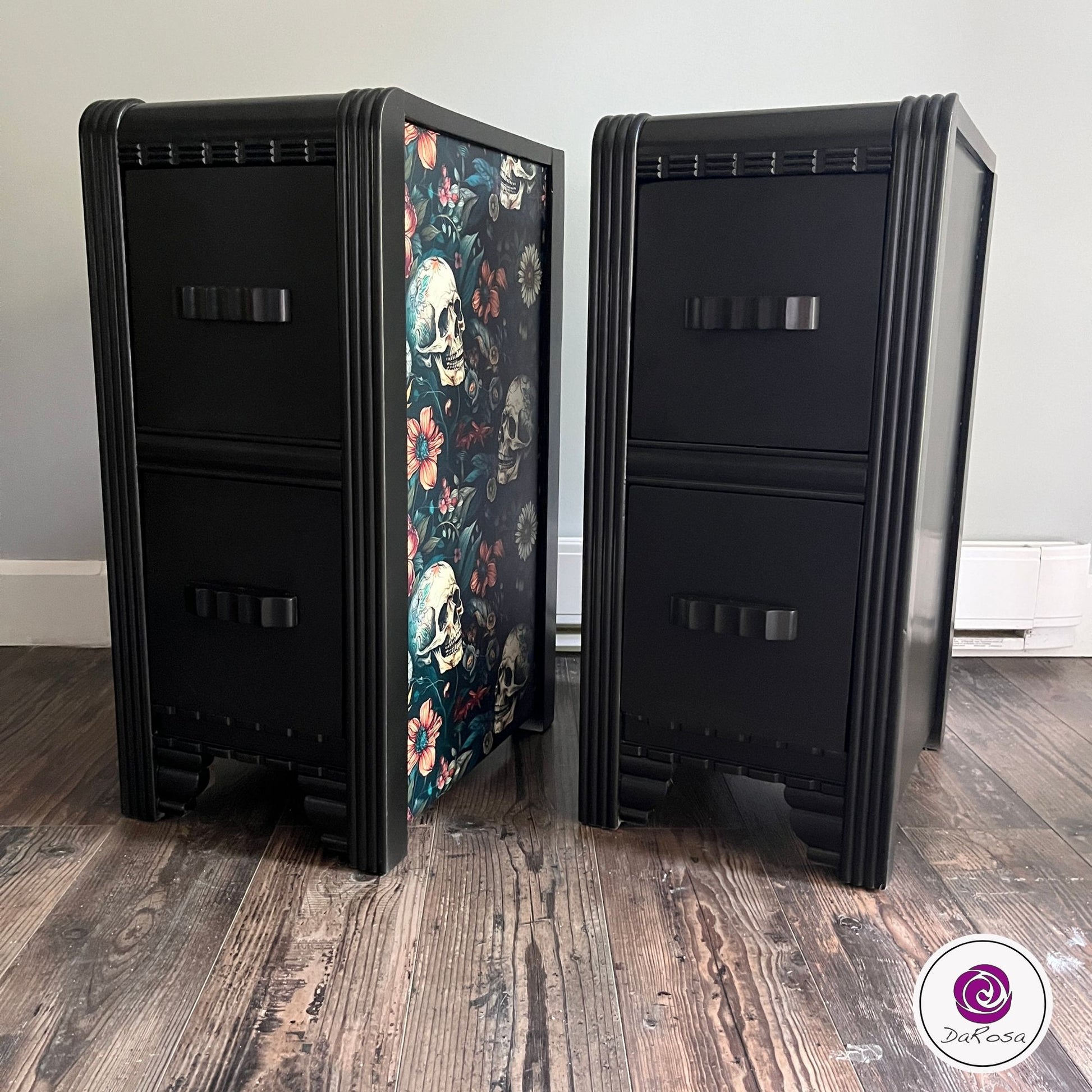 Bold and moody, this one-of-a-kind pair of refinished art Deco nightstands are painted in Black with a stunning skull and floral decorative paper on the inside. Originally created from a vintage desk, these are truly unique statement pieces!