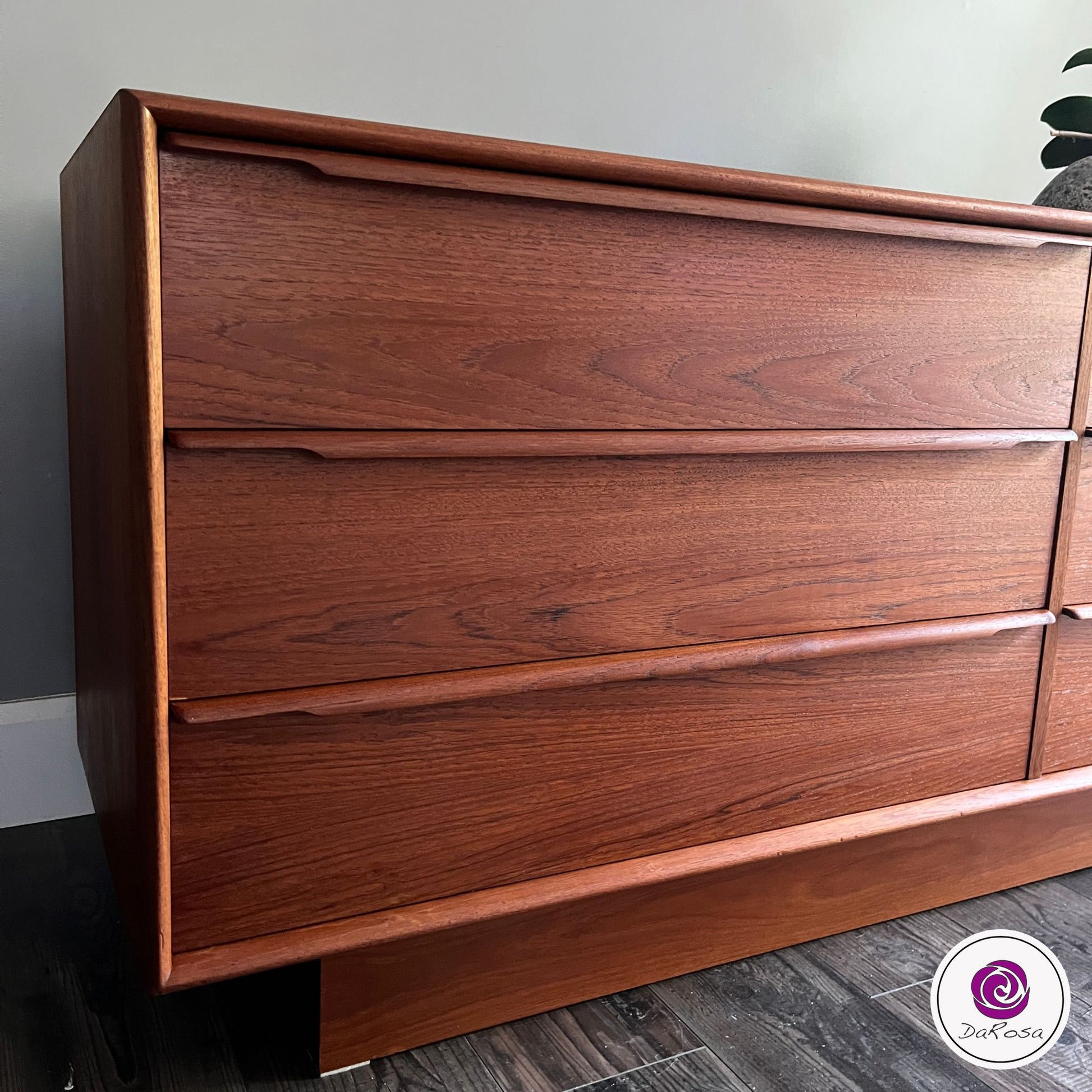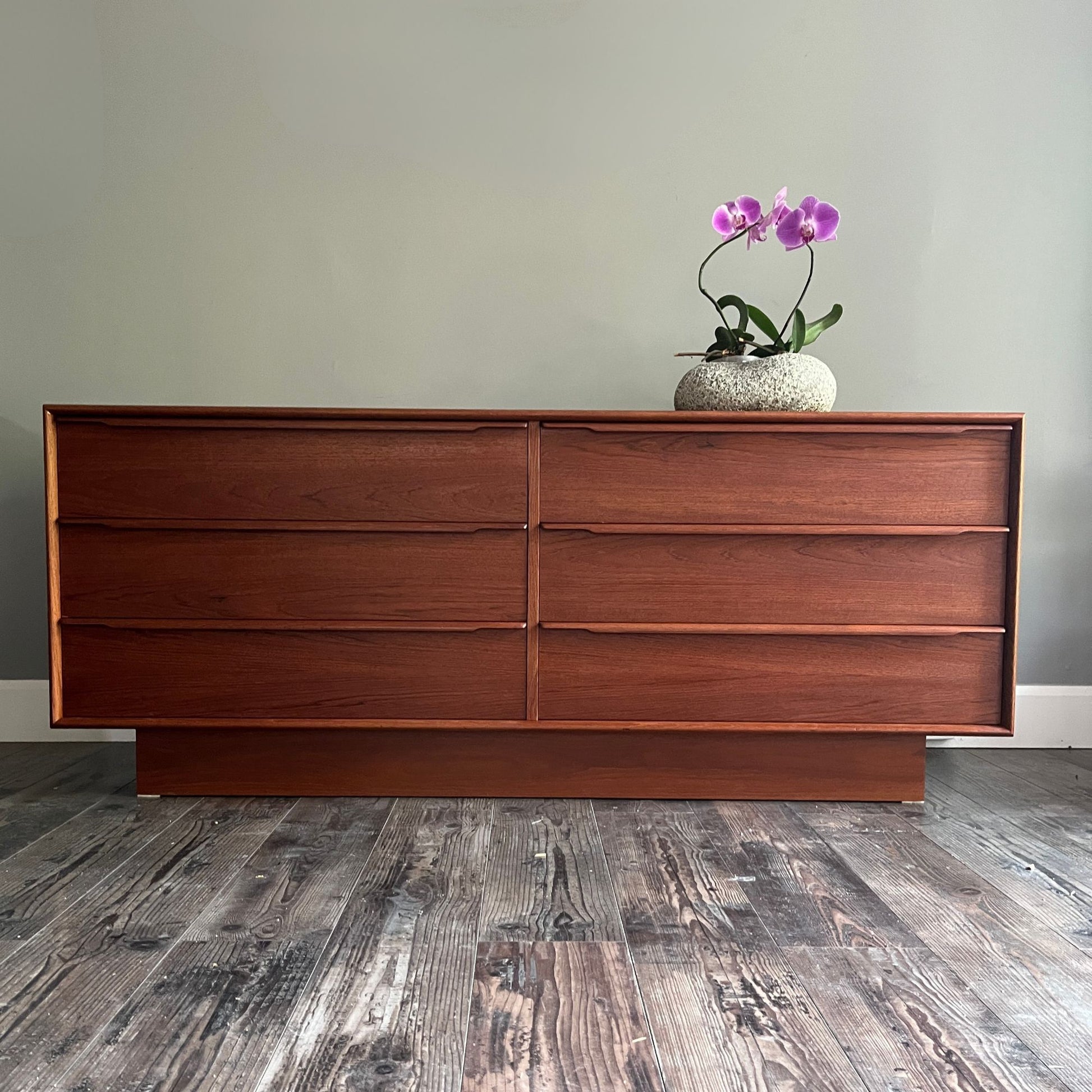 Beautiful vintage lowboy dresser featuring clean Mid-Century Modern lines and rich wood tones. This piece offers six spacious drawers with sculpted integrated pulls and a sturdy plinth base.